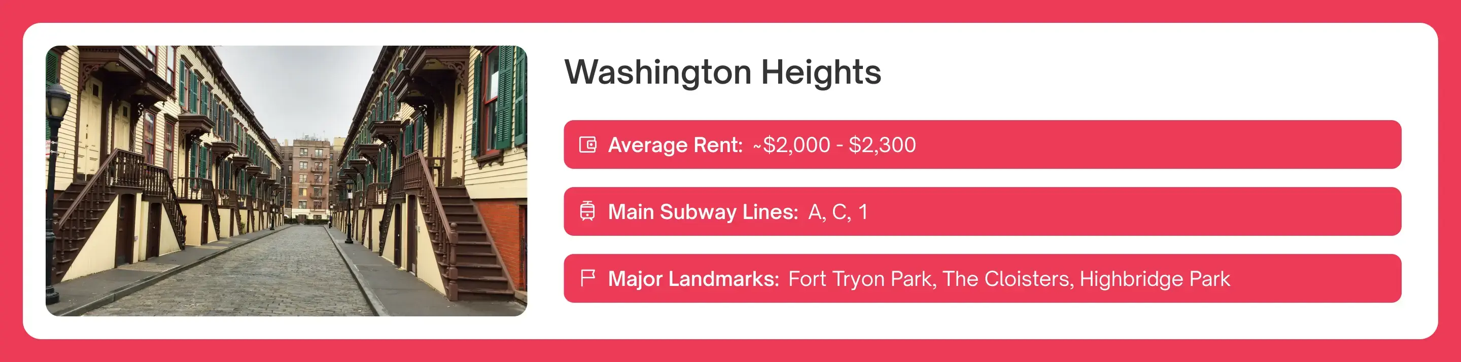 Washington Heights is better than a good-value locality, it's a cultural hub and one of the most affordable Manhattan neighborhoods in 2025. Located at the north end of Manhattan, it provides breathtaking views of the Hudson River, pre-war buildings, and convenient proximity to Midtown on the A, C, and 1 trains. To know more about how to use the subway, check out our blog on how to use subway in New York City.