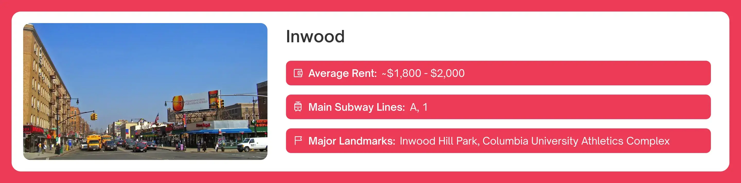 Despite this natural vibe, Inwood is still firmly connected to the city via the A train (which goes express downtown) and the 1 train (local). These connections make it a strategic choice for commuters looking for affordable neighborhoods in NYC without long transit times.