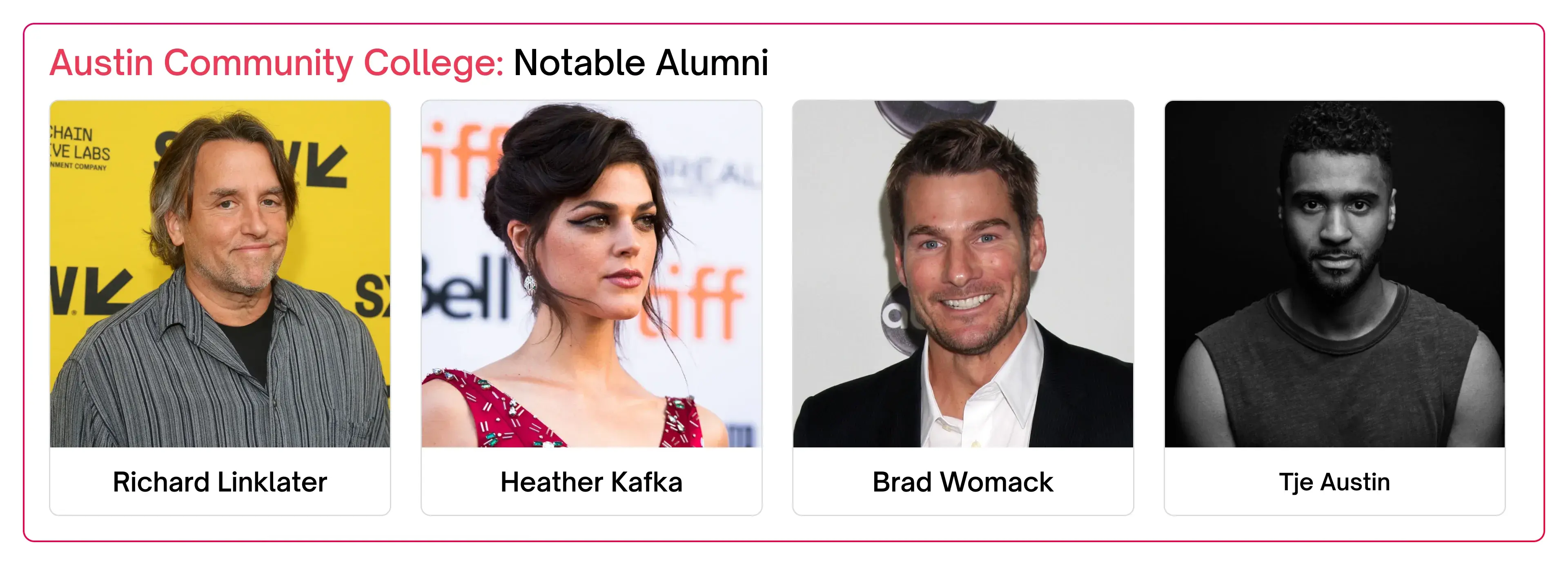 Numerous professionals, artists, and leaders from a variety of industries have had their careers launched by Austin Community College over the years. ACC graduates have established themselves early in the fields of technology, the arts, education, and public service, even though many students transfer to four-year institutions. Among the well-known alumni are: