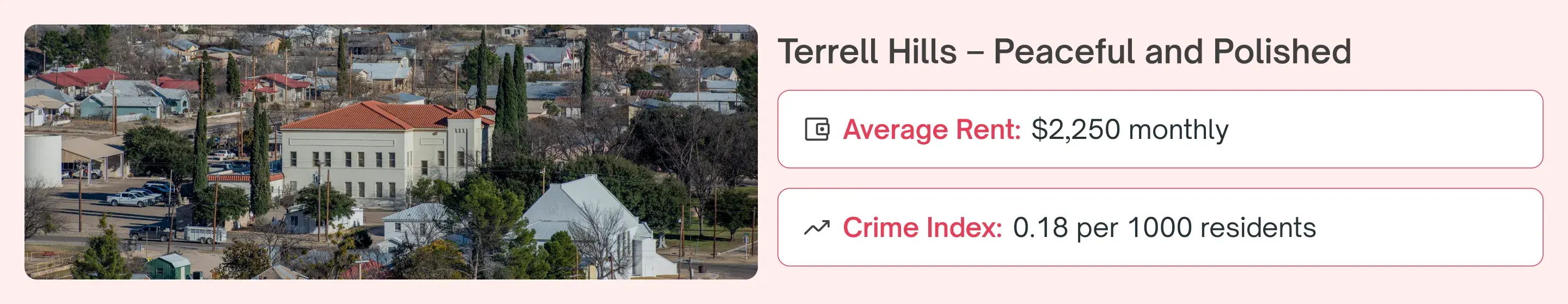 Located near Alamo Heights, Terrell Hills is a top choice for families and professionals in San Antonio. The area features spacious lots, mature oak trees, and beautifully crafted homes. Residents enjoy a safe, close-knit community with top-rated schools like Alamo Heights High School. Nearby spots like The McNay Art Museum, The Quarry Golf Course, and Lincoln Heights Shopping Center offer arts, leisure, and shopping minutes away. Terrell Hills offers an elegant blend of history, privacy, and exclusivity. A neighbor to Alamo Heights, it’s considered one of the best neighborhoods in San Antonio, TX, for families and professionals alike. Explore convenient and affordable student housing options near Terrell Hills.