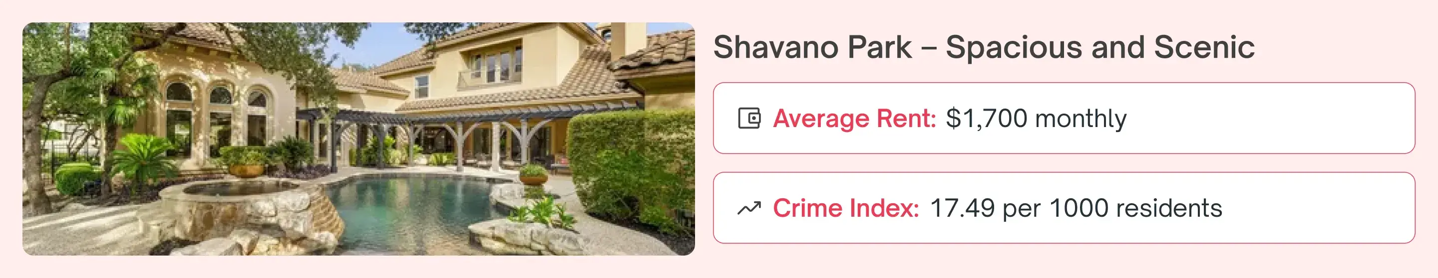 Situated in northwestern San Antonio, Shavano Park offers large lots, mature oak trees, and custom-built homes, making it one of the best neighborhoods in San Antonio for those looking for space and serenity. Despite its suburban feel, you’re still within reach of top-tier dining, schools, and healthcare facilities. The community is known for being family-friendly, with low crime rates and plenty of outdoor recreational areas. For students, there are also convenient and affordable student housing near Shavano Park to suit your needs.