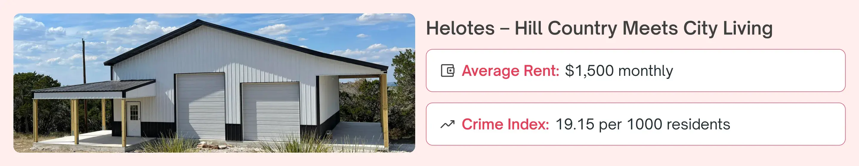 Although technically a suburb, Helotes is an increasingly popular choice for those seeking the best place to live in San Antonio with natural beauty. Rolling hills, wide-open spaces, and a small-town vibe make it feel like a country escape, while still being within 30 minutes of downtown. Helotes’ outdoor lovers will enjoy the hiking trails, farmer’s markets, and community events. Helotes is a smart pick for anyone who wants peace, privacy, and access to excellent public schools, all without losing touch with city life.