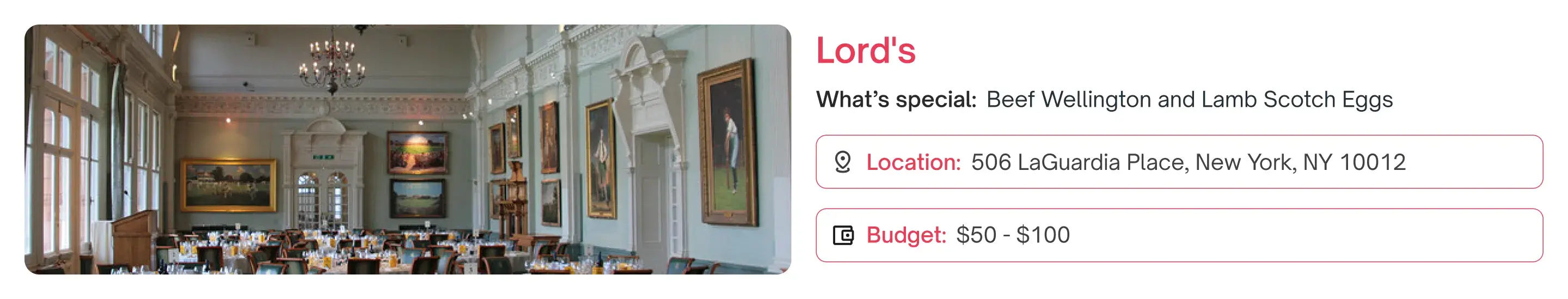 A refined British bistro nestled in the West Village, Lord’s is one of the top restaurants in New York. Its nose-to-tail menu features bold offal dishes like tongue, tripe, and black pudding, each crafted with intention and depth.