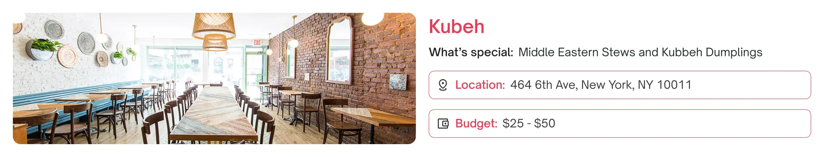 Kubeh stands out for hearty Middle Eastern comfort food near NYU, with notable dishes like the Lamb Toast with red tahini and pickles, and the ChickenSchnitzel served with roasted potatoes and a green salad.