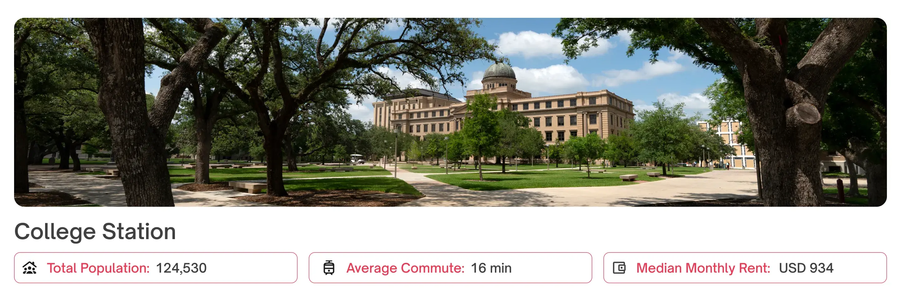 The George Bush Presidential Library also offers cultural experiences, while Kyle Field has exciting SEC football games. Housing costs in College Station are reasonable compared to bigger Texas cities, though rentals can be competitive because of the university.
