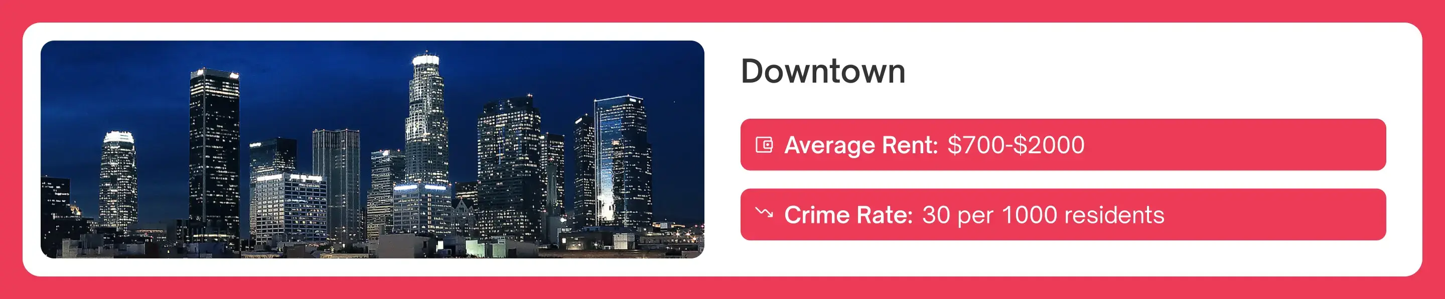 Apart from this, renters can find several green spaces, such as the Grand Hope Park and the Grand Park. Downtown is also among the few regions that offer easy access to public transport, which makes it one of the most affordable neighborhoods in LA, especially popular for student housing in Downtown.