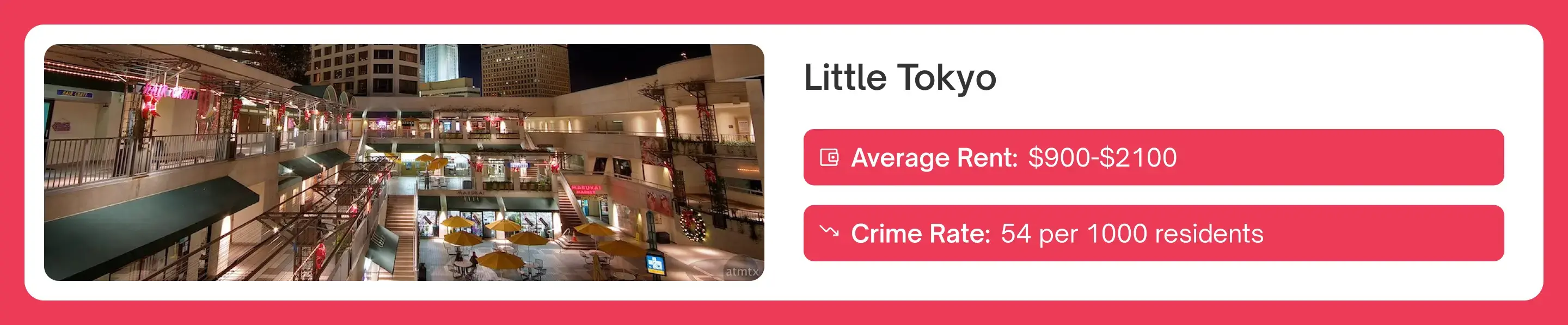 Little Tokyo also has a diverse market that offers a variety of goods, including anime figures, collectables, and kimonos. Students, drawn to the area's affordability and its proximity to USC, UCLA, and Woodbury University, often seek out student housing in Little Tokyo, making it one of the most affordable LA neighborhoods.