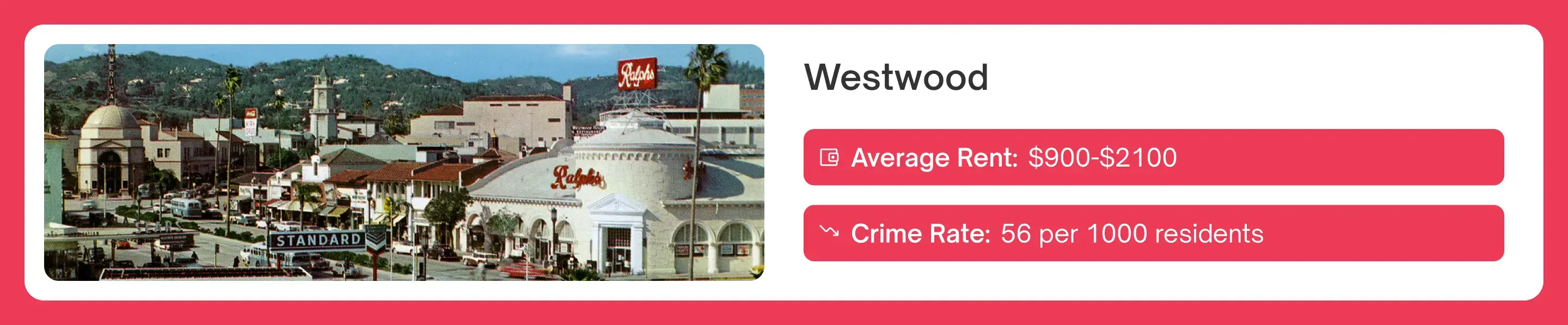 This urban neighborhood is a top choice for students, with student housing in Westwood being highly sought after, thanks to its unbeatable location on the Westside and its close ties to UCLA. The region was developed to cater to the various needs of the students of this prominent university for public research.