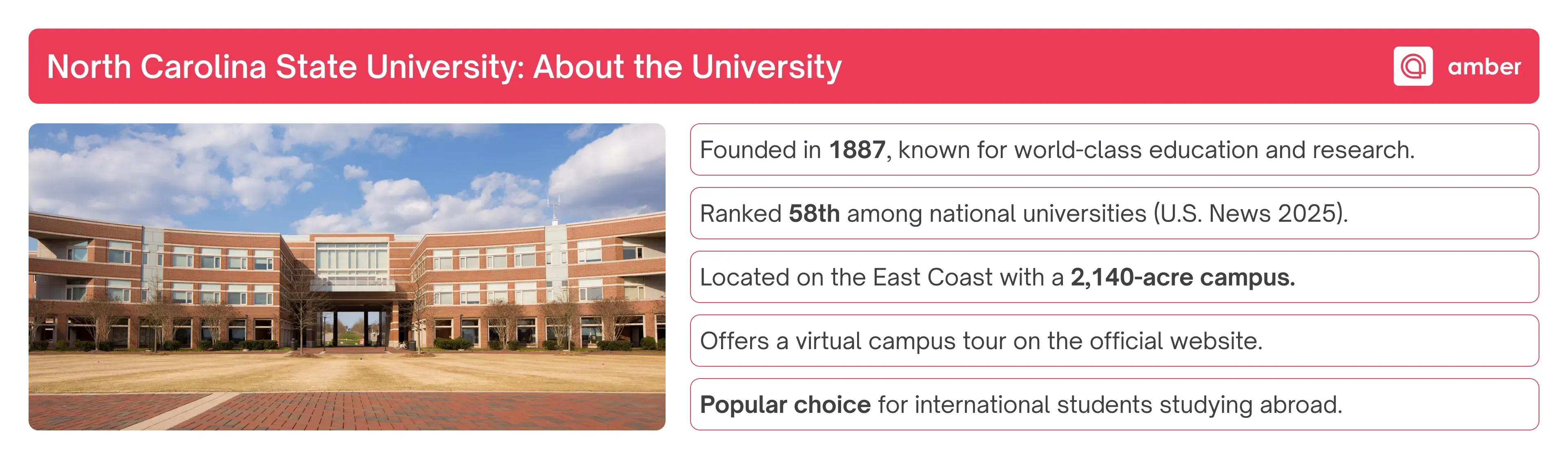- Amber Scholar Program: Students applying to NC State should also consider the Amber Scholar program, which offers grants and scholarships to international students to help with their living expenses overseas, in addition to university-based scholarships. In order to lessen their overall financial load, candidates who use the Amber platform for accommodation are frequently granted priority consideration.