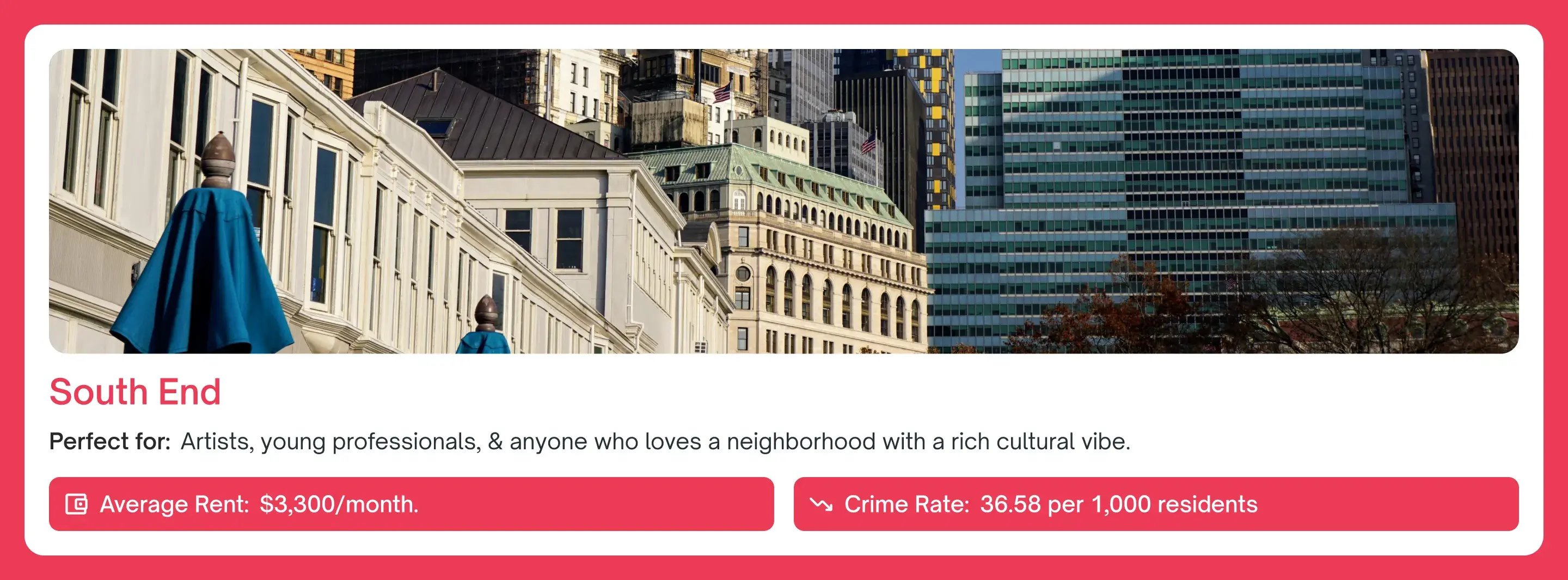 The South End is another one of Boston's historically rich neighborhoods, offering residents a mix of culture, architecture, and a friendly atmosphere. It’s known for its beautiful Victorian brownstones, a rich arts scene, and being one of the safest places to stay in Boston. While rent prices are higher here compared to some of the more affordable neighborhoods, it remains one of the safest and most desirable areas. The South End has a low crime rate, especially in comparison to other areas in the city. It’s a well-patrolled neighborhood with a lot of foot traffic, so safety is never a concern here. It's one of the safest neighborhoods in Boston, especially for those who appreciate an artistic, urban feel.
