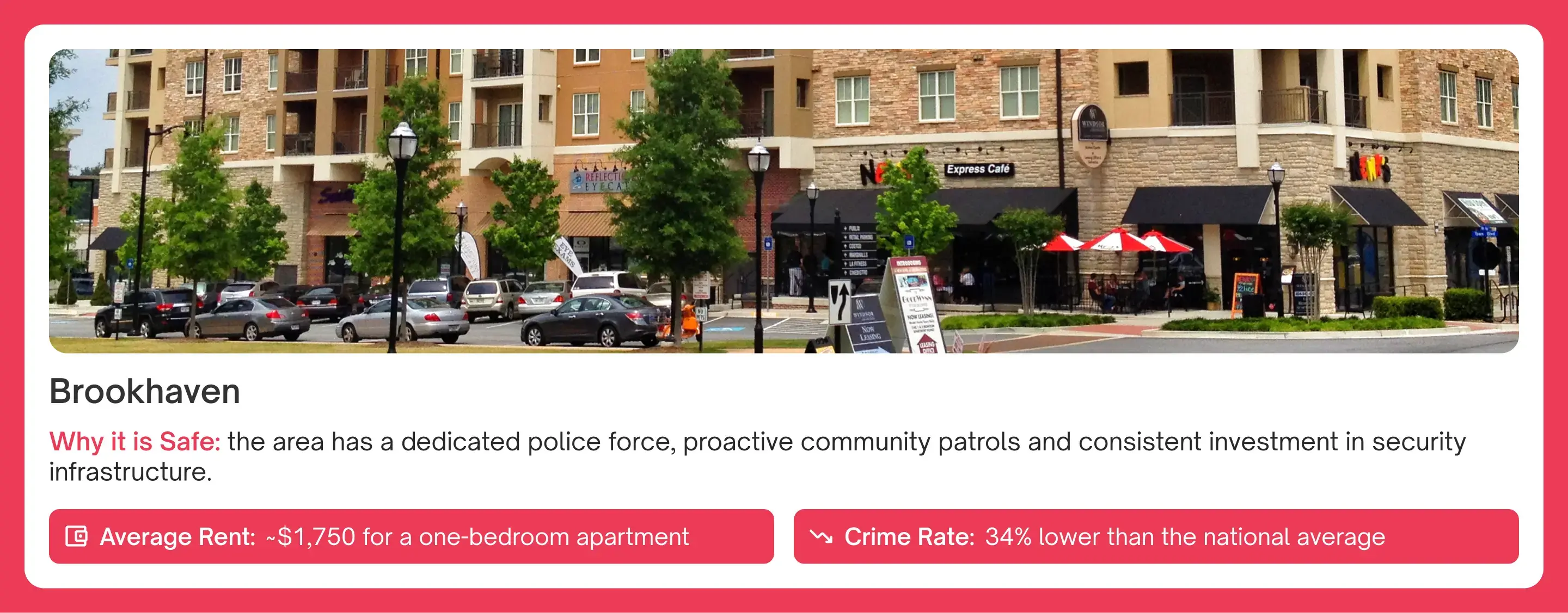 Brookhaven is consistently one of the safest neighborhoods in Atlanta, GA for students, young professionals ,and families who desire that elusive balance between urban access and suburban ease. It has its own police force that is renowned for quick response times and regular neighborhood patrols, ensuring top-notch safety here. Well-lit neighborhood streets, low crime rates, and high walkability are all supported by robust infrastructure and active neighborhood groups. You'll discover a lively combination of restaurants, retail, and parkland, such as Murphey Candler Park, that makes it the gem in any collection of safe suburbs of Atlanta .