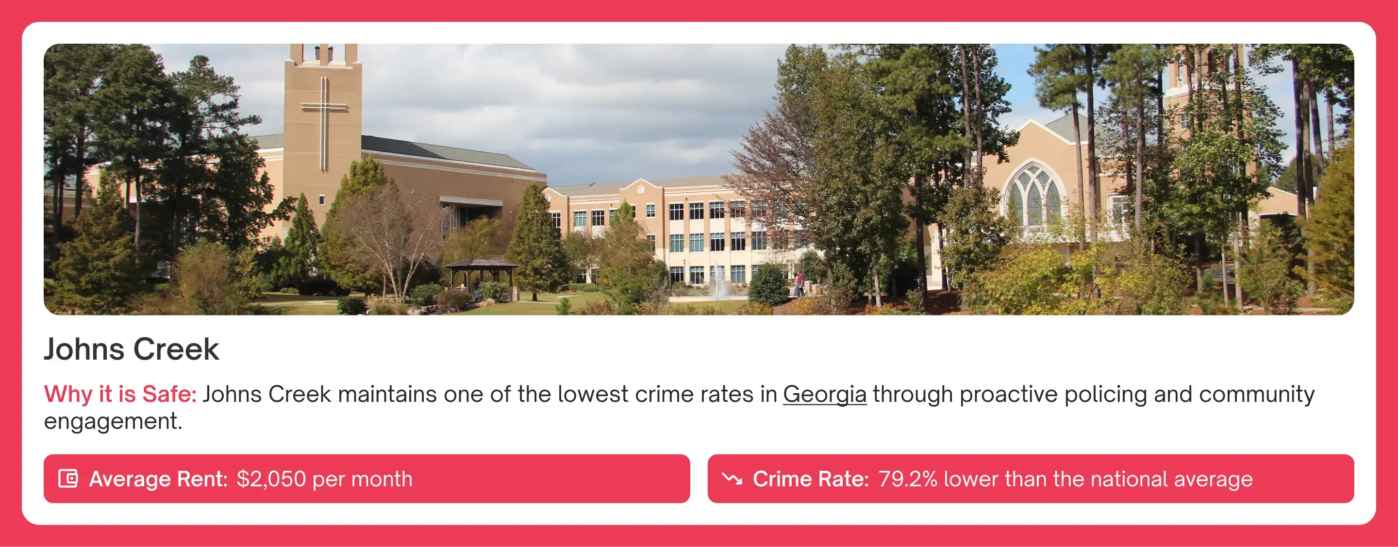 Located northeast of Atlanta, Johns Creek is famous for its highly rated schools and upscale neighborhoods. The police department of the city focuses on community policing, building close ties with citizens to prevent crime effectively. With plenty of green areas such as the Chattahoochee River and Autrey Mill Nature Preserve, Johns Creek provides a peaceful atmosphere suitable for family life.