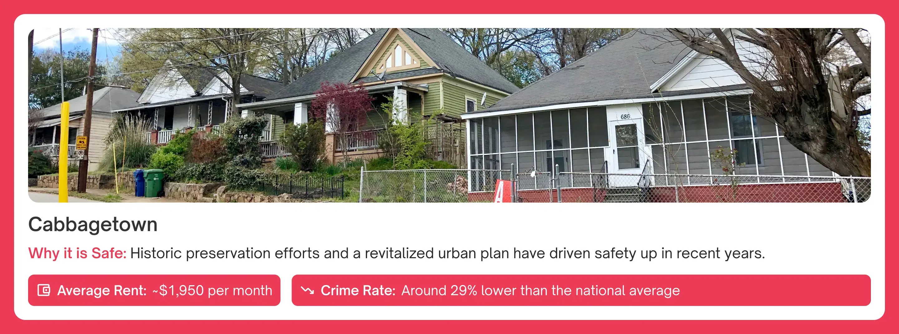 Cabbagetown has become one of the low-key safest areas in Atlanta to live, thanks to its close-knit community of artists, young professionals, and active neighborhood organizations. Proximity to the BeltLine also means high visibility and increased foot traffic, which deters crime.