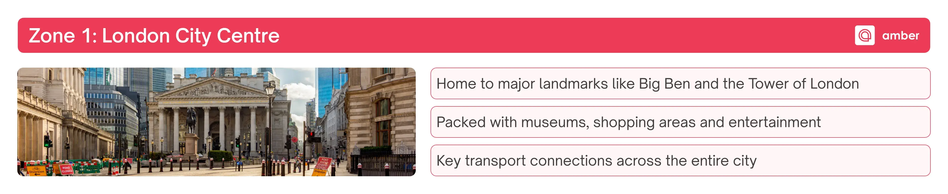 Zone 1: Central London – The city centre has major landmarks and attractions.