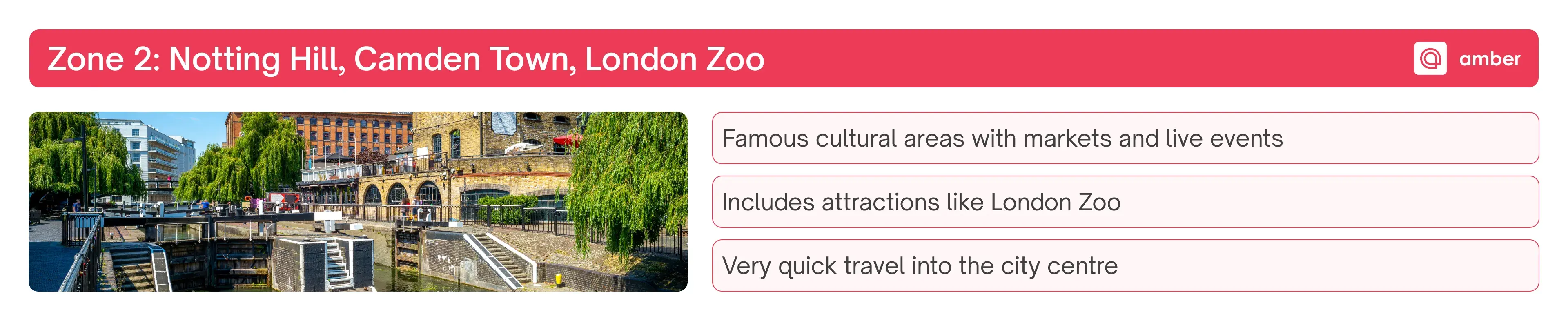 Zone 2 is a cultural hub with the trendy streets of Notting Hill, the alternative charm of Camden Town, and the zoological wonders of London Zoo, along with two prominent football stadiums for sports enthusiasts.