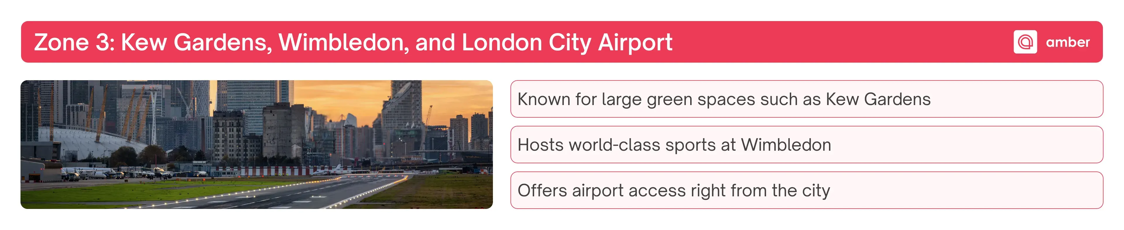 Embracing natural beauty, Zone 3 features the lush landscapes of Kew Gardens, the renowned Wimbledon tennis championships, and the convenience of London City Airport for quick getaways.