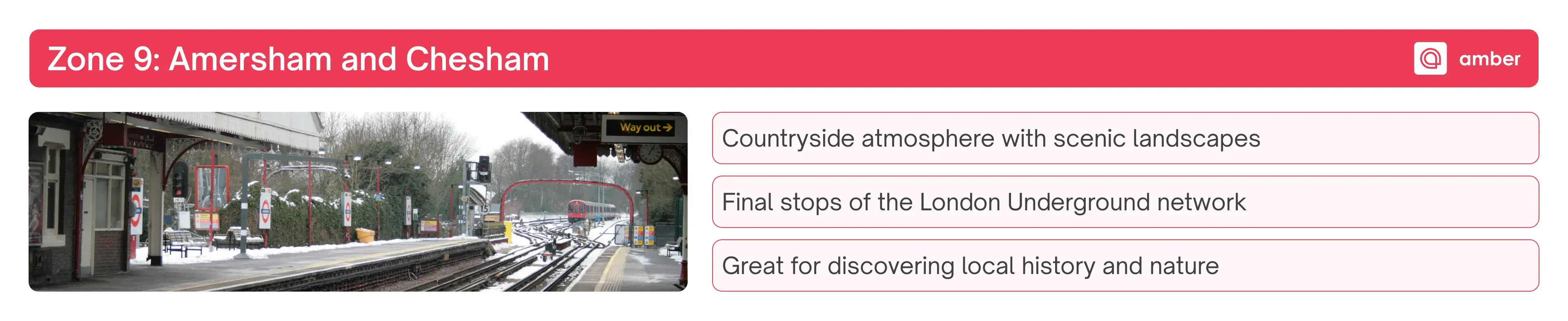 Zone 9: Amersham and Chesham – The outermost zone, featuring rural charm, scenic beauty, and a historic atmosphere.