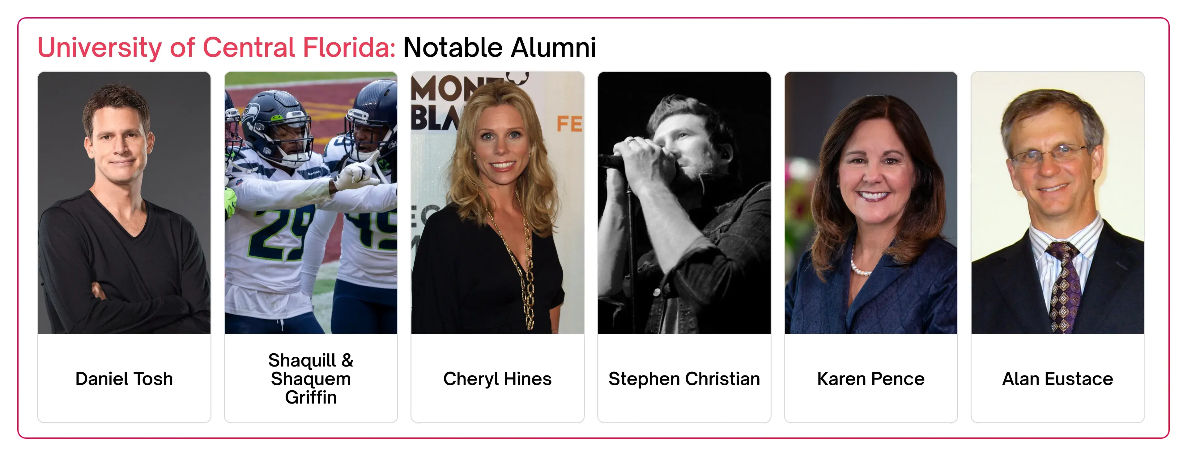 Alumni from the University of Central Florida have achieved success in a wide range of industries, including technology, business, sports, entertainment, and politics. These people demonstrate the variety of career options that a UCF degree can lead to, and many of them continue to be actively involved with the university community through alumni events, guest lectures, and mentoring.