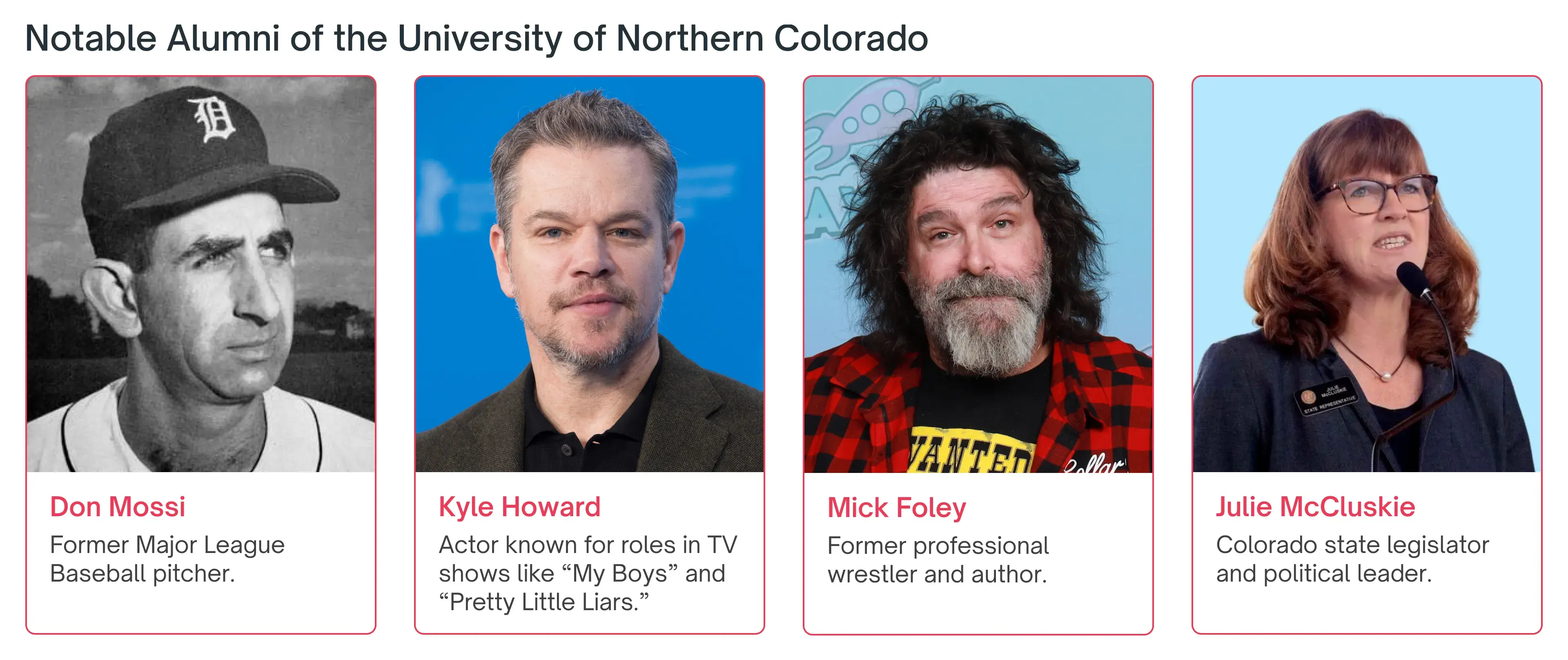 The University of Northern Colorado Notable alumni include people who have made important contributions to business, politics, education, and sports. Notable UNC alumni include:
